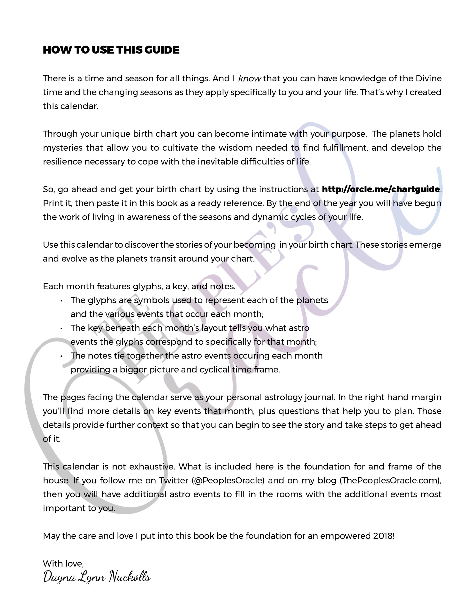 Begin by printing your sidereal birth chart using the guide provided at orcle.me/chartguide. Then you can print and paste onto a designated page in this guide. Or, keep that digital too and use your own journal or notebook to follow along with the astrology outlined each in month.