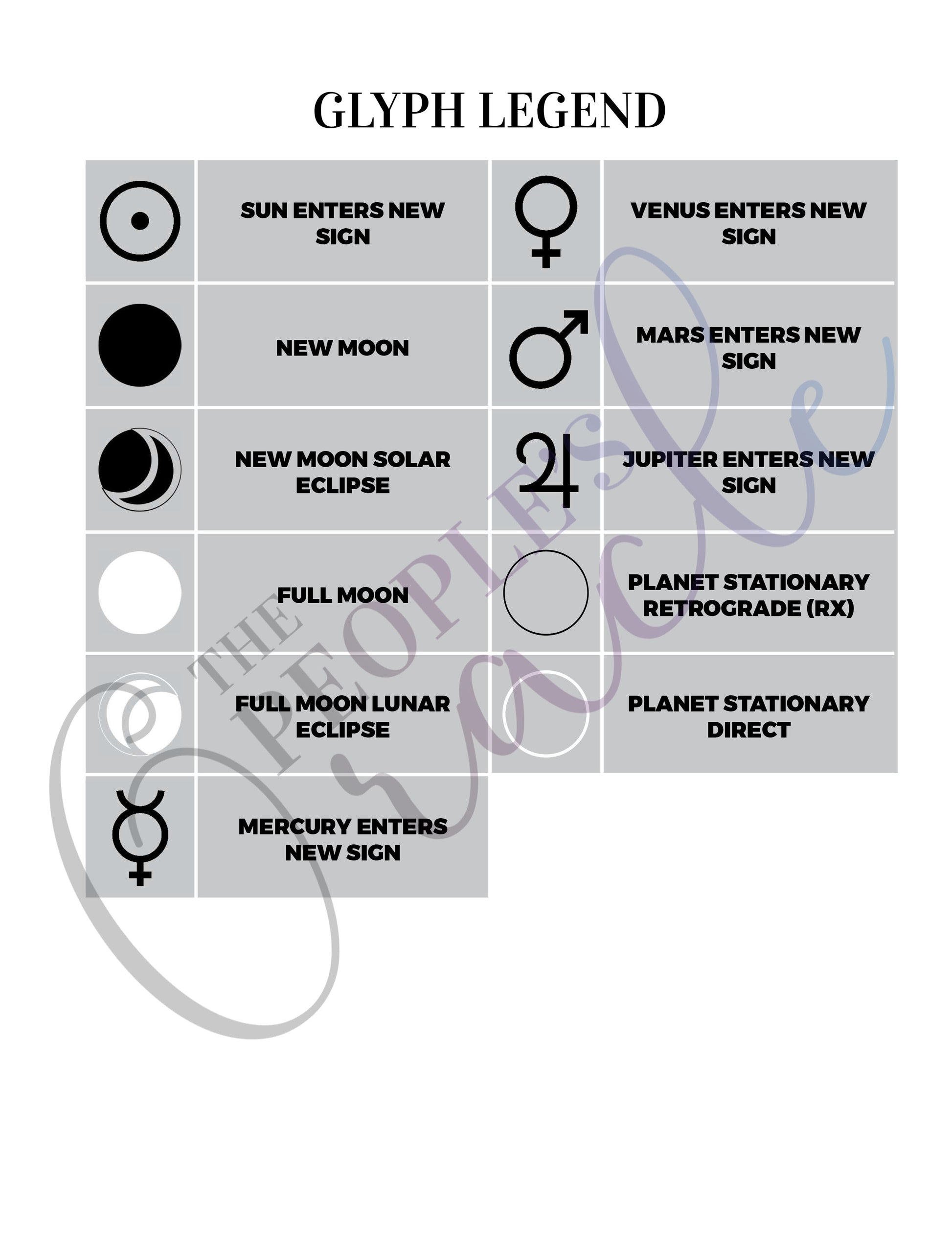 Each month features the dates of New & Full Moons, planetary sign changes, retrograde and direct stations of planets, and eclipses.