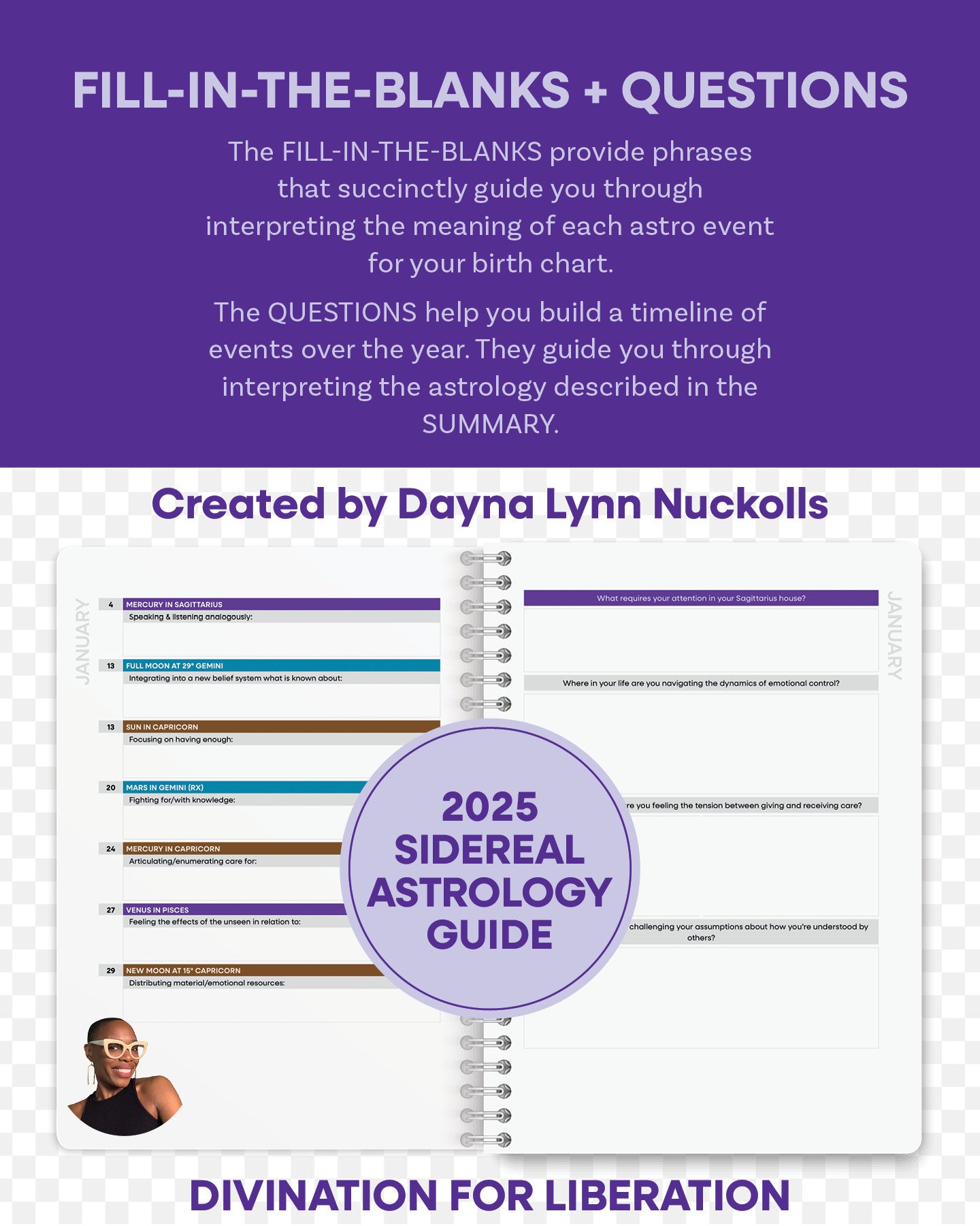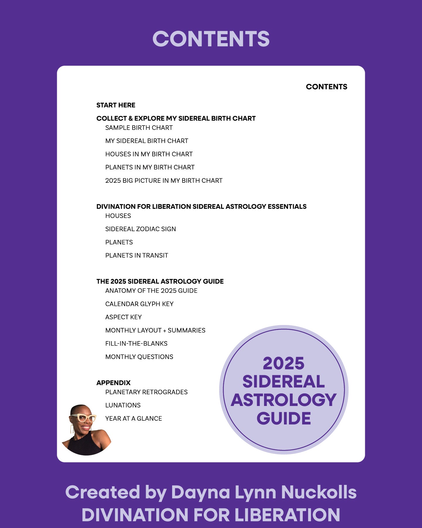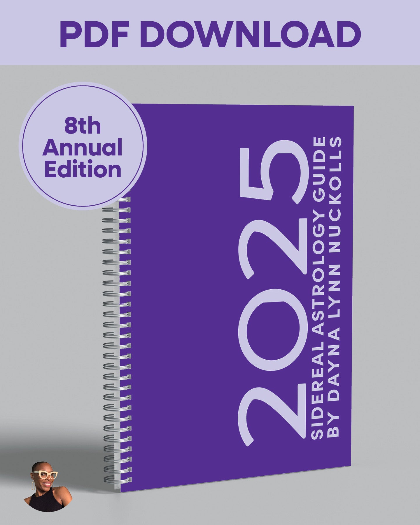 DOWNLOAD the 2025 Sidereal Astrology Guide, the 8th annual edition of the Divination For Liberation Sidereal Astrology calendar, workbook, and journal that walks you through the personal application of one year of astrology. No previous astrology knowledge required.